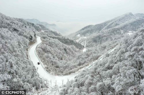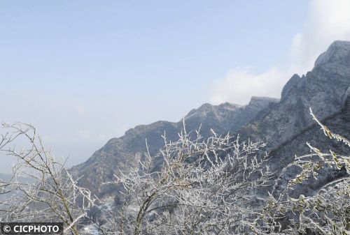 ↑2023年2月14日在湖北省襄阳市保康县马桥镇横溪村茅山岩拍摄的雪后雾凇。CICPHOTO/陈泉霖 摄
