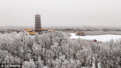 ↑2023年2月14日,甘肃省酒泉市金塔县沙漠胡杨林景区出现雾凇景观。(无人机照片)CICPHOTO/曹红祖 摄