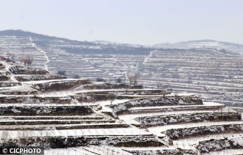 ↑2023年2月19日在甘肃省平凉市静宁县双岘镇尤家村拍摄的雪后梯田。CICPHOTO/王毅 摄