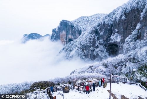 ↑2023年2月15日,游客在重庆市南川区金佛山景区赏雪游玩。(无人机照片)CICPHOTO/罗川 摄