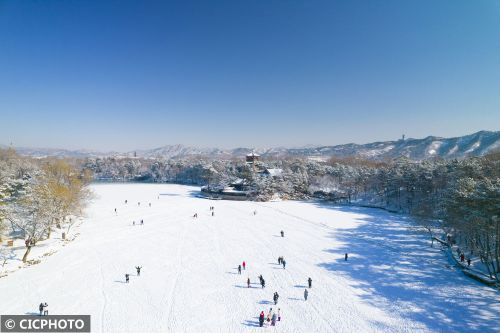 ↑2023年2月19日,游客在河北省承德市避暑山庄景区赏雪游玩。(无人机照片)CICPHOTO/孙占军 摄