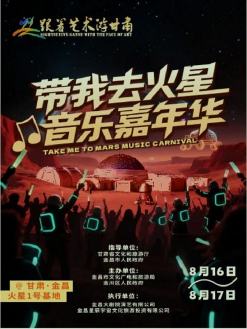为拓展“跟着艺术游甘肃”展演活动综合效应,展示金昌市现代与浪漫的城市魅力,以艺术赋能金昌火星1号基地文旅IP实现资源转化,带动金昌文旅市场发展,8月16日至17日,由甘肃省文化和旅游厅、金昌市人民政府指导,金昌市文化广电和旅游局、金川区人民政府主办的“跟着艺术游甘肃——带我去火星”音乐嘉年华活动将在金昌火星1号基地震撼启幕。本次活动将融合流行音乐、先锋艺术与金昌独特地貌,为所有热爱探索的旅行者打造一场沉浸式艺术之旅。