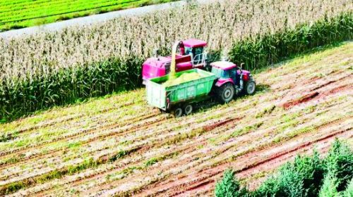 今年,临夏县共种植玉米17.59万亩,其中粮饲兼用型青贮玉米达4.7万亩,可产出青贮饲料12.9万吨,预计11月份全面完成青贮工作。图为新集镇青贮玉米种植基地收割现场。( 临夏融媒记者 马博文文/图)