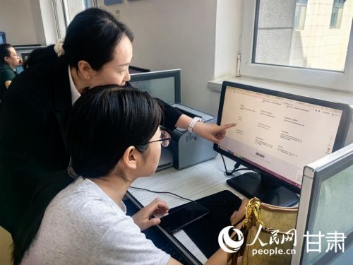 兰州新区政务服务大厅便民自助服务区工作人员协助群众填写申报材料。人民网记者 周婉婷摄