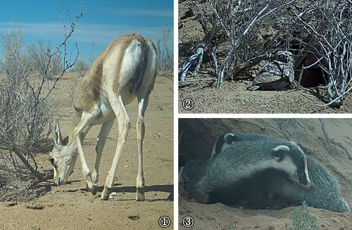 临泽县治沙林场记录到的野生脊椎动物。①长尾黄羊②穴鸮③狗獾。