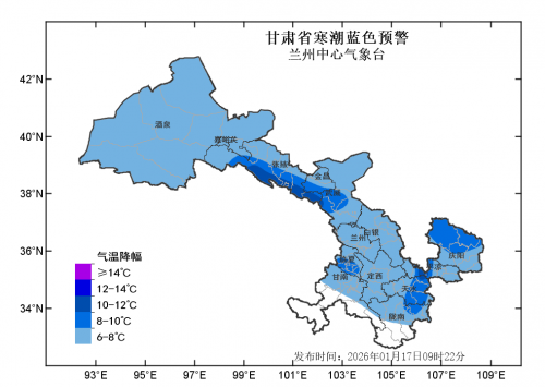 兰州中心气象台2026年1月17日9时22分发布寒潮蓝色预警:预计18-20日,全省大部分地方最低气温将下降6-8℃,河西五市、陇中、陇东南局部地方最低气温将下降8-10℃,其中,祁连山区、六盘山区降温可达10℃以上,将出现寒潮。河西五市最低气温出现在19日清晨,省内其余地方最低气温出现在20日清晨。请注意防范!